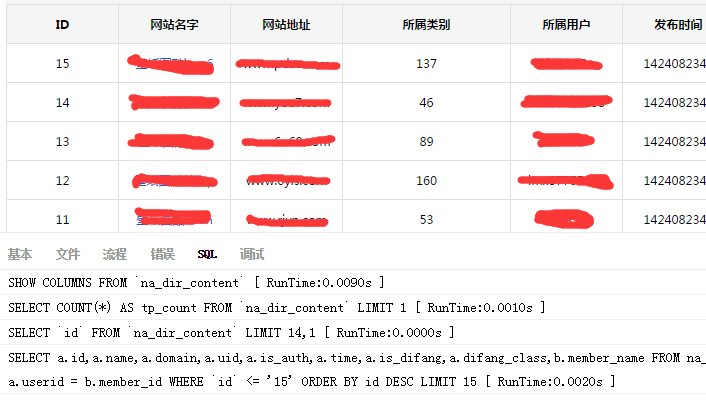 $list = $dircontent->field('a.id,a.name,a.domain,a.uid,a.is_auth,a.time,a.is_difang,a.difang_class,b.member_name')
